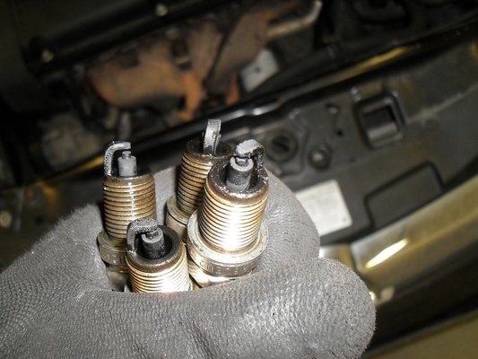 A sűrítési ütem végén a nyomás mindegyik hengerben meghaladta a 14 bart, ami jó értéknek mondható. Máshol kell keresni a hibát. Írtam már, hogy fals levegőre gyanakszom, ugyanakkor a gyújtógyertyák állapota borzalmas. A nívópálcát kihúzva nem ért meglepetés.