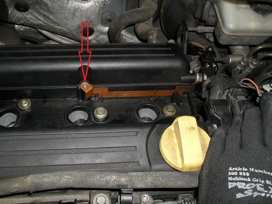 Mivel a szelepfedél műanyagból van, a gyártónak máshogyan kellett gondoskodnia a trafó testpontjáról – ezt a képen látható rézlemezzel biztosította. A piros nyíllal jelölt furatnál csatlakozik a gyújtásmodul egyik stiftje, ami a csavar szorító erejével biztosítja a kapcsolatot.