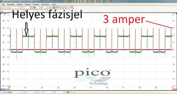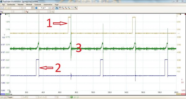 A képen látható oszcillogram 1-es, és 2-es jele megfelelő és értelmezhető. A motor szépen is jár. A zöld színű érték viszont nem csak nekem értelmezhetetlen, hanem a motorvezérlő elektronika számára is. Számomra a munkámban az a pillanat a legnagyobb élvezet, amikor rájövök egy hibára. Rövid ideig tart, de kárpótol minden addigi szívásért. Hogy egy rendszert megjavítson valaki, elengedhetetlen, hogy ismerje annak működési logikáját. Mivel a motoron nincs vezérműtengely-helyzetérzékelő, az elektronika visszacsatolást vár a gyújtásmodultól, hogy megtörtént az adott hengerekben a gyújtószikra kisülése. Ezt az információt az integrált elektronika küldi vissza valamilyen értelmezhető jelként a motorvezérlő elektronikának.