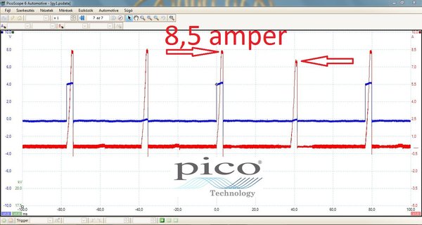 Értelmezzük, mit látunk. A kék négyszögjellel a motorvezérlő elektronika az 1-es és 4-es hengerekhez tartozó primer végfoknak adja a parancsot a gyújtószikra létrehozására. Leegyszerűsítve: az integrált motorirányító rendszerekben ez vette át a megszakító feladatát. A piros pedig a trafón elhelyezett elektronika áramfelvétele, a testkábelén mérve lakatfogóval (1-es képen a piros csipeszvégű, fekete kütyü). Ennek az elektronikának a 8,5 amperes áramfelvétele nem megfelelő érték, ahogyan az sem, hogy ingadozik is. Kérem, ezt fogadják el, mint tapasztalaton alapuló megállapítást. Egy pillanat alatt megvilágosodtam: rossz a trafó testelése, ezért a beszerelt elektronikán keresztül veszi fel a primer áramot. Ez megnöveli annak terhelését, ezért nyírta ki 150 kilométer alatt az előzőt, amit a másik szervizben építettek be. Multiméterrel megmértem a trafó testpontját az akkusaruhoz képest, és a feltételezésem beigazolódott: megaohmnyi a két pont közötti ellenállás.