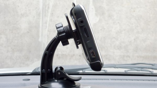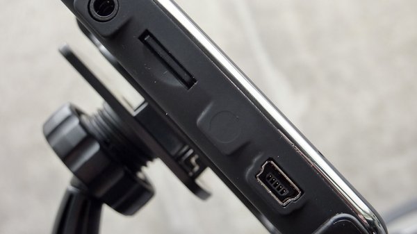 Ami a csatlakozókat illeti, kellemes nosztalgiával néztem a mini-USB-t a Wayteq-en, mert a micro-USB az új divat, pedig egy tucat drótom passzolna a másikhoz. Van 3,5-es fülhallgató-kimenet is, plusz egy micro-SD kártyahely. A tartó elég kompakt, kis masszív cucc, viszont erősen döntött szélvédőnél célszerűbb állítva odacuppantani valamilyen vízszintes felületre, ha van ilyen.