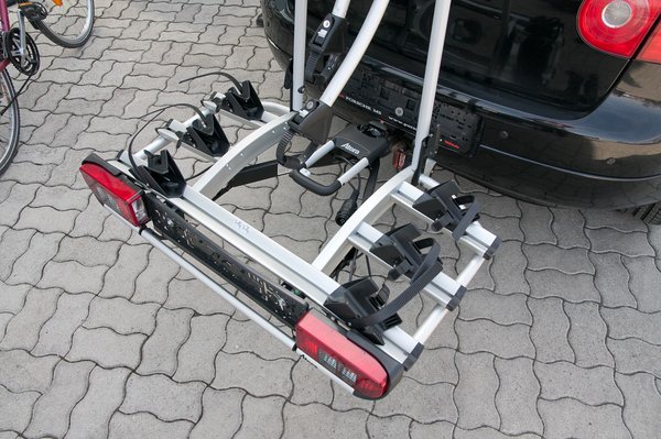 A vonóhorogra szerelhető tartóknál szintén fontos szempont, hogy a csomagtartó valahogy hozzáférhető maradjon. A képeinken látható Atera tartó esetében egy ívelt sín szolgál a kerékpártartó hátranyitására, amihez mindössze a hátsó lámpahídon kell egy léccel oldani a reteszelést. Persze ez sem a legolcsóbb modell.