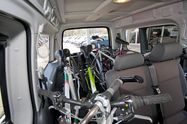 Az, aki nagyban gondolkodik, vehet hatalmas kocsit. Például a cikk elkészítéséhez segítséget nyújtó Weltauto telephelyén ennek illusztrálására előkerítettek egy VW Caddy Life-ot, amely ugyebár a Caddy furgon nyújtott, személyszállító változata. Ebben egyetlen ülés előrehajtogatásával négy kerékpárt sikerült úgy elhelyeznünk, hogy ehhez mindössze az első kerekeket kellett kiszerelni. Azaz minden ülő utasra jutott egy.