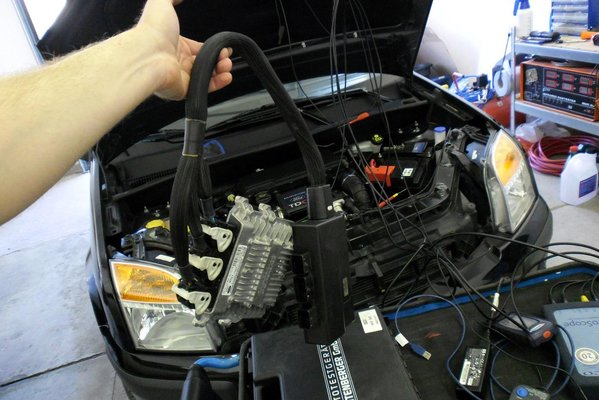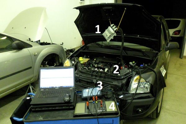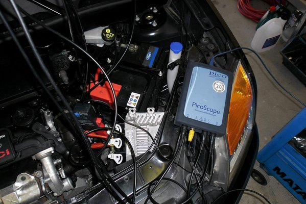 Az alább következő képen látható, ahogyan megpróbáltam levenni a kívánt jeleket a motorvezérlő elektronikáról. Sajnos a rossz kontaktus hatással lehet a mérés megbízhatóságára, ezért szereznem kellett egy Y kábelt. Nagyon sokféle, hasonló közdarabot kell készleten tartani, ha az ember kényelmesen akar végrehajtani pontos méréseket - nekem például az adott típushoz éppen nem volt megfelelő fajtájúm. Az a szerencsém, hogy általában kölcsön tudok kérni ilyeneket egy műszerforgalmazótól, bár a legjobb mégis az lenne, ha a polcomon volna. Gondoltam ráalkudok, aztán ha nem sikerül megvennem, csak kibérelem.