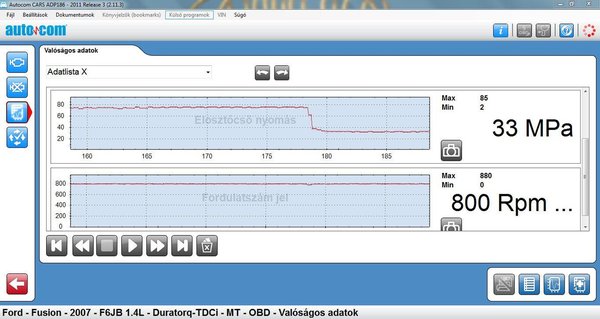 A képen felül az elosztócső nyomása látható, alul a motorfordulatszám. A hiba, hogy változatlan motorfordulat mellett a közös nyomócső (rail) nyomása időnként 300 bar helyett 760-ra nő. Ilyenkor fémes kopogás hallatszik minden munkaütemnél, és villog a műszerfalon a hibajelző lámpa. Az eldöntendő kérdés, mi volt előbb: a tyúk vagy a tojás? A drasztikus nyomásnövekedés maga a hiba, vagy az csak a hibára történt beavatkozás a motorirányító rendszer részéről? Gondoljanak bele, mi van, ha egy vasúti átjárón hajtanak át az autójukkal, és a motorvezérlő elektronika durva hibát észlel, amitől megáll az autó. Még az a szerencsésebbik eset, ha ilyenkor vészüzemre kapcsol, és ezt kontrollámpával jelzi, de a kereszteződést még el tudják hagyni. De mi van, ha lefullad a motor? A befecskendező-rendszer hibája életveszélyes is lehet.