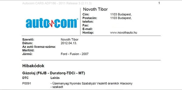 „T. Novoth Úr! A mai napon telefonon történt megbeszélés alapján megküldöm a ...-... frsz-ú Ford Fusion adatait, illetve hibájának rövid leírását. Adatai: motorszám: F6JB, 1399 cm3 dízel, 50 kW. 2008.01.09-i üzembe helyezésű, a gyártási éve 2007 dec. A hiba leírása: menet közben kigyullad a sárga motorhiba kijelző műszer, s ilyenkor hangosabb és erőtlenebb lesz a motor. Az első időszakban körülbelül 2-3 km után ismételten eltűnt a jelzés, és erőre kapott a motor. A fogyasztás is nagyobb lett. Azt vettem észre, ha menet közben leállitom a motort és újraindítom, körülbelül 2-3 km megtétele után ismételten elalszik a lámpa és rendesen működik a motor.