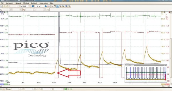 Elindult hát a vadászat. Mindenképpen el kellett csípnem a hiba beálltának pillanatát. Csak hogy az előbbi vázolt példával érzékeltessem a mágnesszelep működését: itt az a bizonyos ablaknyitogatás ötezred másodpercenként történik. A fenti képen az látható, hogy a rail nyomás érzékelő feszültségjele (zöld) stabil 300 barnak megfelelő. Ez alapjáraton normális. A piros nyíllal jelölt pillanatban azonban a nyomásszabályzó szelep utasítást kap arra, hogy emelje meg drasztikusan a rendszer nyomását.