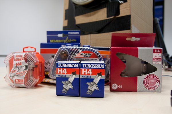 Az izzók beszerzése köré nem csináltunk nagy cirkuszt, Papp Tibi elment egy autósboltba, és ami kapható volt, abból vett egy párat, ami ez esetben kettőt-kettőt jelent. Így összesen lett egy normál Tungsram H4 referencia izzónk, és mellé öt kihívó, amelyek 60-90%-os fényerő növekedést ígértek. Ne menjünk el a tény felett, hogy némelyikre az volt írva, hogy „up to 60%”, tehát ez azt is jelentheti, hogy akár 60%-os fényerő növekményt produkálhat, de senki nem állítja biztosan. A másik dolog, amely a mérést egy kicsit bezavarhatja, az maga a szemünk. A szem érzékenysége nem azonos a különböző színek, színhőmérsékletek esetében. Így simán előfordulhat, hogy egy sárgább, például a 5000 K színhőmérséklethez közelebb álló színt erősebbnek látjuk, mint a kékebb, (fehérebb?) 5300 K színt. Az emberi szem a nap fényére a legérzékenyebb, ez körülbelül 5000 K. A halogén izzók jellemzően a sárgásabb 2800-3200 K tartományban vannak. A színhőmérsékletüket a bennük lévő gázzal és a bura festésével is tudják módosítani. A bura festése egy gagyi módszer, mert a fényerőt jelentősen csökkenti, azonban a színhőmérsékletet megváltoztatva a szemünk lehet, hogy mégis szubjektíven erősebbnek észleli. Látni azonban nem fogjuk vele jobban a sötétben botorkáló gyalogost a vidéki éjszakában.