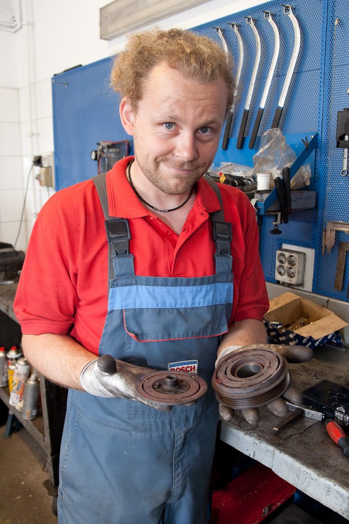 Kész az üzemi riport. Miközben szedelődzködöm, Márk lekapja a zörgő klímakompresszort az aknán álló Daewoo Kalosról. "A tárcsa alatt levő csapágy lesz az" – lötyögteti meg, és egy perc múlva már le is bontotta a kompresszor elejét. És tényleg, a golyókosár valahol, valamikor szétporladt, a csapágy golyói a gravitáció hatására összegyűltek a pályájuk alján. "Látod, ez az elektromágneses kuplung, ez is meg van égve. Egy bontott kompresszort tettek fel, de nem kenték meg a legfontosabb helyeken. A száraz csapágy melegedett, hevítette a tekercset, ami ezért néz ki ilyen szörnyen. Minimális karbantartás itt is garantálhatta volna a hosszú életet – most örülhet a tulaj, ha nem kell majd kicserélni az egész kompresszort.