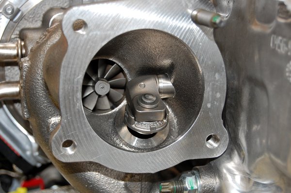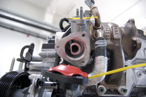 Az integrált lefúvószelepes (BOV) aprócska turbótöltő is érdemel pár szót. Mivel az autó start-stop rendszerrel szerelt, a turbó vízhűtésének keringetéséről külön elektromos pumpa gondoskodik, amely termikus igény esetén a motor leállítása után még forgatja a vizet a turbó körül, így a visszahűlése gyors. A pici feltöltő maximális fordulatszáma mintegy 248 ezer fordulat percenként, ami még turbó mértékkel is sok. Ezzel próbálták a kis feltöltőt széles motor fordulatszám tartományban munkára bírni. A házába integrált lefújószelep gázelvételkor a felépülő nyomást elegedi, így a picike járókerék nem lassul annyira le, a turbólyuk szinte észrevétlen marad.