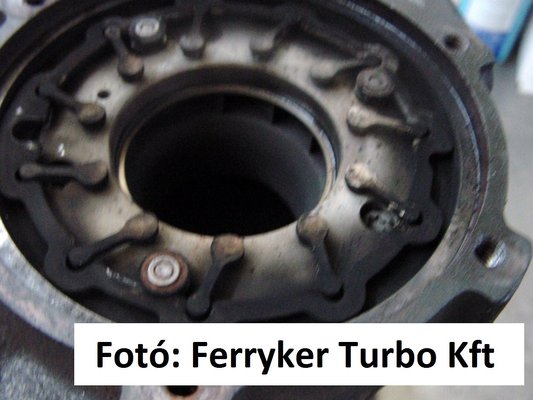 A fenti képen látható a szabályozott geometriás turbó lényege. A már sokat említett vákuumdob a rudazaton keresztül mozgatja a külső gyűrűt, ami belül, a kis karok segítségével állítja egy terelő segítségével, milyen szögben érje a turbinakereket a kipufogógáz. Ha jobban hajtja, a kompresszorkerék nagyobb töltőnyomást állít elő, ha kevésbé, kisebbet. Így tudja a kisebb motorfordulathoz tartozó gyengébb kipufogógáz-áramlás ellenére is felépíteni a megfelelő turbónyomást, ha nincs lekormolódva.