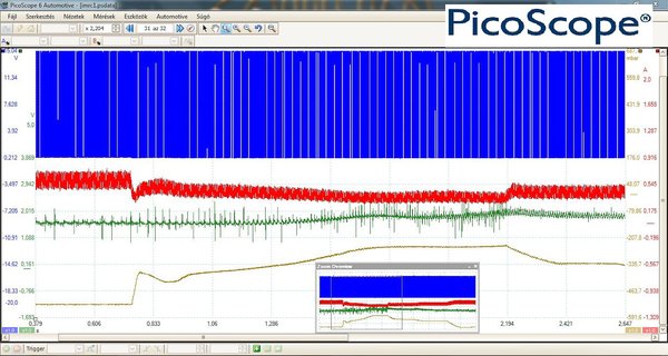 Az elosztótól a szabályozott vákuumot bevezettem a Pico WPS 500 X vákuumnyomás-mérő egységbe, így az oszcilloszkóp egyik csatornáján látom, hogy miként alakul a valós vákuumszabályzás. Ezt a kis, tenyérnyi eszközt napi szinten használom, és bár nem volt olcsó – negyedmillió forint – mégis megérte az árát. A további szükséges mért értékek a szabályzó mágnesszelep áramfelvétele és testvezérlése. Meg kell tudni, hogy a vezérlőelektronika egyáltalán akarja-e, hogy növekedjen a turbónyomás, s ez kiolvasható a testvezérlés kitöltési tényezőjének a változtatásából. Erről a motorirányító rendszerekben megszokott vezérlési módról korábban írtam már, és egy hasonlattal próbáltam szemléltetni.