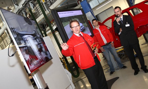 Ekkor lépett színre a szerencsekerék, amiről kiderült, hogy egy hatvan iránymikrofonból és egy kamerából kendácsolt zajmérő ernyő, amivel monitoron azonosítani tudják a különböző frekvenciájú zajforrásokat a motortérben. Demonstrációs jelleggel beindítottak egy állványra szerelt 1,8 TFSI motort, majd kihúztak egy dugót a vákuumszivattyúból, és a bubogó hangra egyből megjelent egy csibesárga mező a képernyőn, pontosan ott, ahonnan a rendellenes hang jött. Jól jönne egy ilyen nekem is a garázsba, milyen szépen látni lehetne, honnan jön a kereplés.