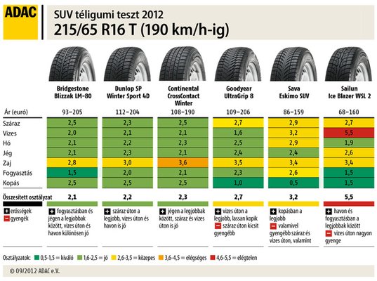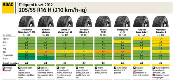 Először is fejben meg kell fordítanunk az iskolás osztályzatokat, mivel a németeknél az 1-es a jeles, az 5-ös a bukó. Majd kicsit ki kell bővítenünk a skálát, mivel az ADAC-sok 0,5-től 5,5-ig osztályoznak. Ezzel már értelmezni tudjuk a táblázat húsát, a sorrendet meghatározó összesített osztályzatnál pedig normális esetben egy súlyozott átlagot látunk (száraz út 15%, vizes út 30%, hó 20%, jég 10%, zaj 5%, fogyasztás 10%, kopás 10%).