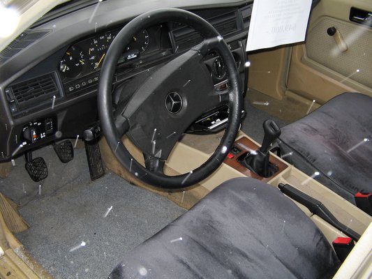 De hopp – amott gyári színű Merci-sárvédő kandikál ki a hó alól. Söpröm le: egy 190-es. Itt horpadás, ott egy kis rozsdapötty, de szép a bele, büszkén, magasan áll. Persze a maszk és a jobb első sárvédő kapott valami puffot is, de legalább nem javították ki, az autó abszolút hiteles, nincs (nagyon) kiglancolva. Megyek be a bódéba, kapom a kulcsot, finom Merci-illat bent, ebben nem dohányoztak. Vezetőülés persze leülve, a kilométer-számláló jócskán négyszázezer fölött (a kocsi kinézete alapján simán vissza lehetett volna tekerni 200 ezerre), kis kopás a térdnél a középkonzolon, viszont a motor szépen indul, minden karosszériadugó a helyén, gyári a fény (volt nálam rétegvastagság-mérő), az autó a négyes váltóra feltett ötös váltógombot és a bebőrözött kormányt leszámítva abszolút gyári.