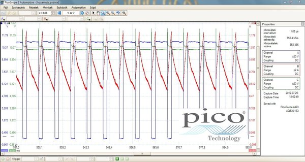 Hogy a tévedést száz százalékosan kizárjam, leszereltem a komplett nagynyomású szivattyút. Egy pillanatra az akkumulátorról üzemeltettem, halk kattanással jelezte, hogy működik, és a scope-képen látható volt az áramfelvétele. Ez megint egy olyan pillanat, amikor jó volna valakivel megosztani a problémámat. Felhívtam egy autóipari villamosmérnök ismerősömet, Besze Gábort. Gábornak nagy valószínűséggel katódsugárcsöves oszcilloszkóp volt a jele az óvodában, mert telefonos elbeszélés alapján bármilyen oszcillogramot el tud képzelni. Osztotta a véleményemet, hogy valószínűleg valahol nem záródik az áramkör, ugyanakkor a kétperces telefonbeszélgetés alatt megtanultam tőle néhány méréstechnikát, amit most a bonyolultsága miatt nem osztanék meg az önökkel. A lényeg, ha a négyszögjel (kék) nullpontja testre zár, akkor a vezérlő valóban működtetni akarja a mágnesszelepet.