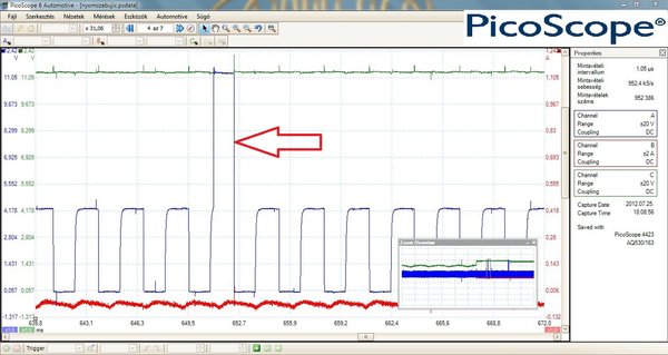 A nyomásszabályzó-szelepet vizsgálva fura mérési eredményt kaptam. A minimális áramfelvételéből (piros hullám) látszik, hogy most a rendszernek ez az áramköre nem működik. Az ilyen beavatkozók általában kapnak egy 12 voltos (inkább az akkumulátor kapocsfeszültségével egyenértékű) pozitív tápot, és a motorvezérlő elektronika a testelés kapcsolgatásával működteti őket. Az oszcilloszkóp felvételen látható, hogy a pozitív tápfeszültséget (zöld) megkapja a mágnesszelep, de a testvezérléssel gond van. 4,2 voltos négyszögjelet mértem, ami néha normális értékre változott (piros nyíllal jelölve). Ez egyszerűen annyit jelent, hogy nem záródik az áramkör. Mintha szakadt lenne a mágnesszelep tekercse. Azt viszont már a vizsgálat elején ellenőriztem, alapfeladat egy ilyen hiba esetén.