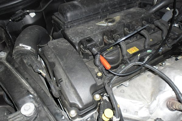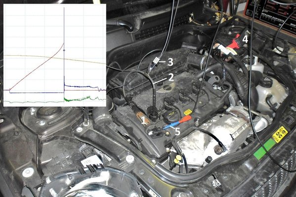 A Mini hengerenkénti gyújtásmodullal (1) rendelkezik, ezeket egyesével kivettem a helyéről, és csatlakoztattam egy öt kiloohm ellenállású magasfeszültséget vezetni képes gyújtókábelt (2). Ez az oszcilloszkópkészletem tartozéka, ilyenkor célszerű használni. A szekunder mérőcsipesz (3) segítségével így meg tudom mérni, hogy a gyújtógyertya megkapja-e a tökéletes gyújtószikra létrehozásához szükséges magasfeszültséget. Eközben az oszcilloszkóp két másik csatornáján vizsgálható még a primeráram (4) és a primerfeszültség (5).