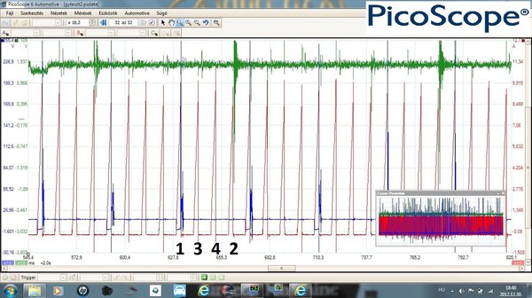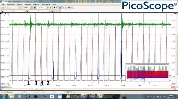 A képen látható, hogy az extra kopogás (zöld) az egyes henger gyújtáskivezérléséhez (kék) viszonyítva gyújtási sorrendben a kettes hengerhez esik. Ezt összevetve azzal, hogy az előző mérés során nyilvánvalóvá vált a kettes trafó gyengélkedése, erős gyanúra adott okot. Az agyamban felvillanó százwattos villanykörte fénye mellett az út szélén felcseréltem az egyes és a kettes henger gyújtótrafóját úgy, hogy a mérési pontokon nem változtattam. Szilveszter előtti nap reménykedtem, hogy az évet egy nagy sikerélménnyel zárhatom.