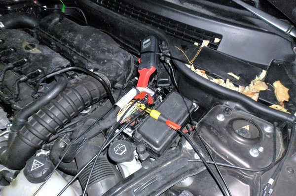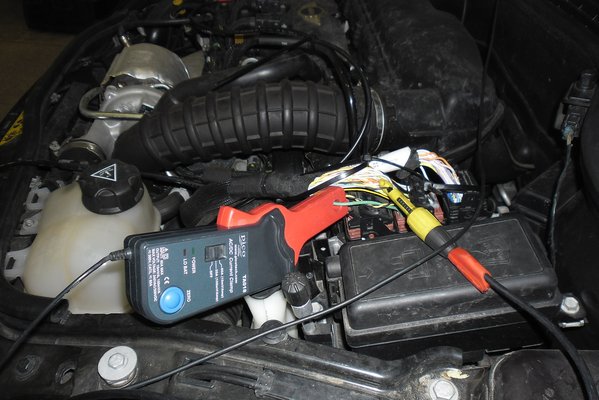 A gyújtásmodulok közös szálon kapják a pozitív tápfeszültséget, erre ráakasztottam az árammérő lakatfogót. Később a mérés során ennek segítségével, és a gyújtási sorrend tudatában lehet majd kiszámolni, hogy melyik hengerhez esik a szuperkopogás. A kopogásérzékelő jelét is a motorvezérlő elektronika elől csapoltam le.