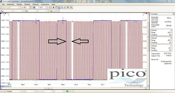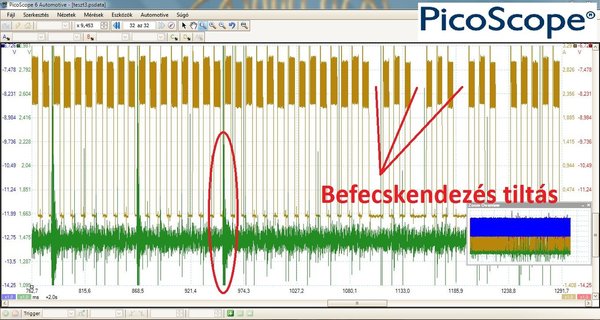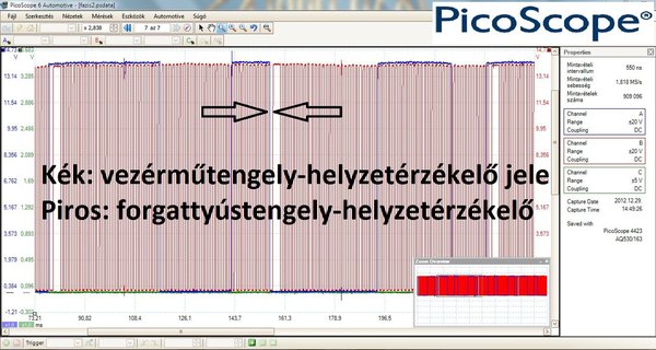 A képen látható, hogy magasabb fordulaton a vezérműtengely és a forgattyústengely jeladóinak nevezetes pontjai között megnőtt a távolság. A vezérműtengely állítóművét egy mágnesszelep vezérli a rendszerben nyomás alatt álló motorolaj segítségével, ezért is fontos, hogy csak a gyártói előírásoknak megfelelő anyagokat használjanak a szervizelések során. Az első próbautat ezekkel a beállításokkal tettem meg, láthatóvá vált, hogy a vezérlés működésében nincs rendellenesség, amikor a hiba jelentkezik.