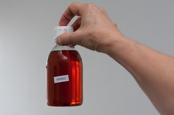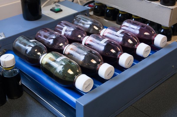 Egy vizsgálathoz mindössze 50-60 milliliter olaj is elég, ez kocsmanyelven bő fél decit jelent. Ahogy elnéztem, az üvegcsék nem csak Magyarországról érkeznek, hanem a MOL összes piacáról, vagyis gyakorlatilag a volt KGST-területéről mindenhonnan. Hogy az olajban egyenletesen legyen ott minden, ne rakódjon ki az üveg alján, egy rafinált görgős asztalon forgatják meg az üvegcséket vizsgálat előtt.