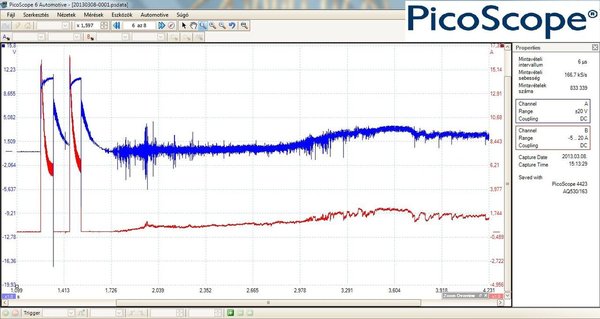 Az oszcilloszkópos felvételen látható, ami hallható is volt, kétszer néhány tized másodpercre működik a tápszivattyú. A csatlakozót lehúzva viszont, a relé működtetése közben megérkezik az akkumulátorfeszültség, tehát valahol a rendszerben a terhelés hatására nő meg kritikus szintre az ellenállás.