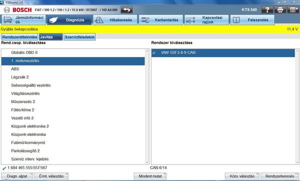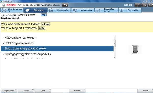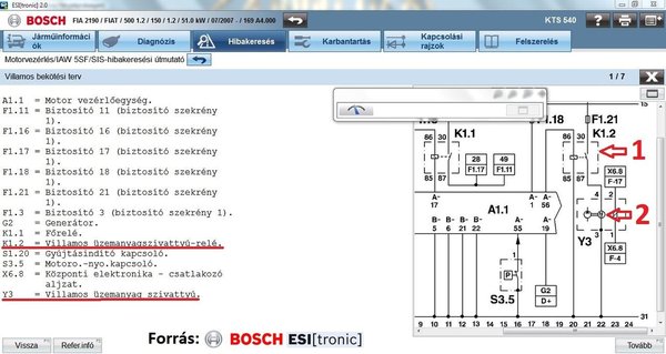Egy márkafüggetlen legális szoftvernek két előnye is van. (Mellesleg köszönet a DDC Kft.-nek, hogy a cikkben szereplő Bosch KTS 540-es készüléket a rendelkezésemre bocsátotta, részletek itt, vagy a honlapomon.) Az egyik, hogy frissíthető, így viszonylag naprakészek lehetünk a műhelyben előforduló típusok terén, a másik, hogy a használata miatt nem térdepel a hátunkon a NAV egyik szorgalmas munkatársa. A tápszivattyúmotor működését leellenőriztem az akkumulátorról közvetlenül rákapcsolt vezetékekkel, így működött. Ha csak a testkábelt helyettesítettem, akkor viszont nem, így gyaníthatóan a relé (a képen piros 1) 87-es lábkivezetése, és a szivattyúmotor (a képen piros 2) csatlakozójának 4-es lábkivezetése között vész el az áram valahol.
