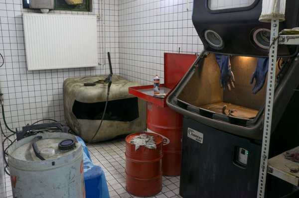 Ez a hármas a kormánymű- és szervojavítás lelke. A 3+2 beállós műhely maga is alkalmas kormányművek ki- és beszerelésére, ha kell, de hozott árut is javítanak. A mosást különös gondossággal végzik, több lépcsőben. Van először egy gőzborotvás előpucolás, amely a sarat, nagyobb mechanikus szennyeződéseket szedi le. Ezt követi a zárt, lúgos, nagynyomású, forró mosás, amely olyan erős, hogy a homokszóró kabinokhoz hasonló, betekintő ablakos, fedeles, kesztyűs szekrényben zajlik. Utána pedig a finom szerkezeteket nagyteljesítményű alkatrészmosón, ecsettel pucolják el. A kormánymű érzékeny ügy, itt egy hajszálnyi piszok is hazavághatja a mechanikát, viccelni nem lehet.