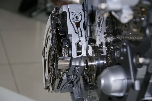 Süketszobában kialakított gépészeti felületek a motoron – ha valaki csúnyának találja a zegzugos, kráteres felületű motort, hát ez részben azért van így, nehogy a nagy, sima felületek óriási hangszórókként rezegve üvöltsenek az utasokra. És persze ott a nagy mumus is a főtengely végén, a rezgéssimító kéttömegű lendkerék, amelynek beszállítója a lengyel Valeo.