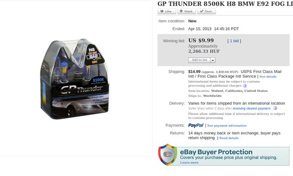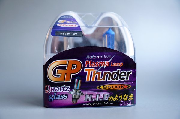 Meg is érkeztek a lámpák – ezért kettő, mert Csongor hozott egy eredetit és egyet az új, GP Thunder nevű gyártmányból, hogy össze lehessen őket hasonlítani. Az Ebayről vásárolt lámpa csomagolásán sok minden szerepel: HID, plasma és a 8500 kelvines színhőmérséklet ígérete. Mint kiderült, ezekből egy sem igaz. A HID ugye azt jelenti: High Intensity Discharge, vagyis „nagyintenzitásúkisüléses” lámpa, ez leánykori nevén a xenonként ismert fényforrás. A plasma (plazma) felirat szintén valami olyat sugall, ami nem igaz: a H8-as izzólámpában nem ionizált gáz (=plazma), hanem izzó volfrámszál szolgáltatja a fényt. A színhőmérsékletről persze csak később derült ki, hogy mennyi igaz belőle.