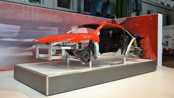 Acélt nyomokban is alig tartalmaz, a váza alumínium profilokból, öntvény csomópontokból és rengeteg szénszálas kiegészítőből áll. Ezt eddig más is tudja. A futóműben még a stabilizátorkar is alumínium, a féktárcsák szénszálasak, a rugói pedig üvegszálas kompozit anyagból készülnek. A kerékagy titán ötvözet és könnyebb, mint a fényképezőgépem. Kicsit labdázunk az egyik rugóval, tényleg alig lehet több egy kilónál. Eláll a lélegzet. A karosszéria vázszerkezete így csak 99 kiló, ami hússzal kevesebb, mint a benzineseké.