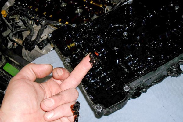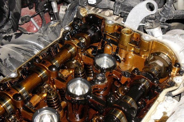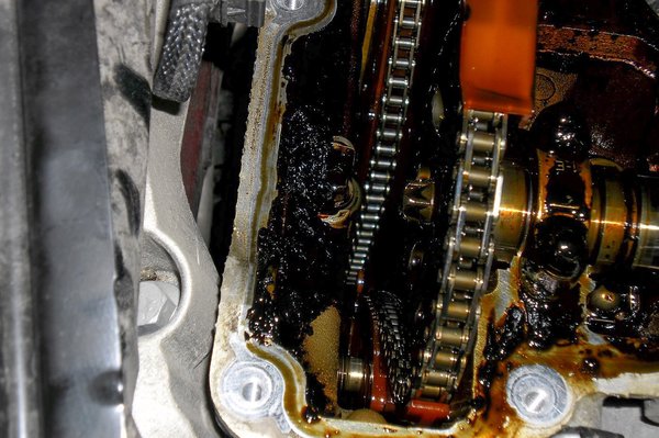 Az ügyfél másik panasza a motor csattogása volt, ezért a részleges megbontás mellett döntöttem. Láttam már néhány szörnyűséget motortérben, de erre azért nem voltam felkészülve. A szelepfedél alatt mindent centis olajsár borított.