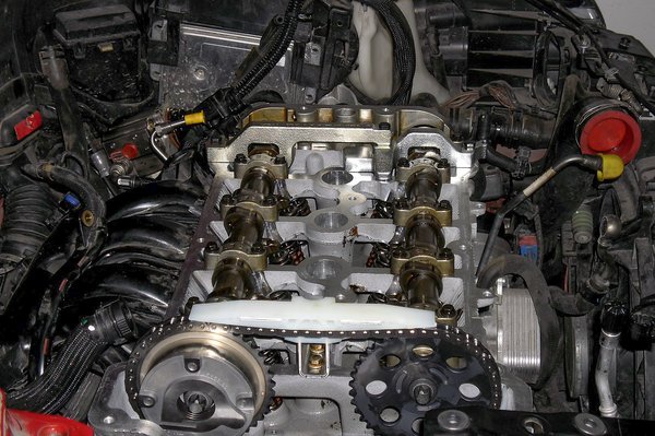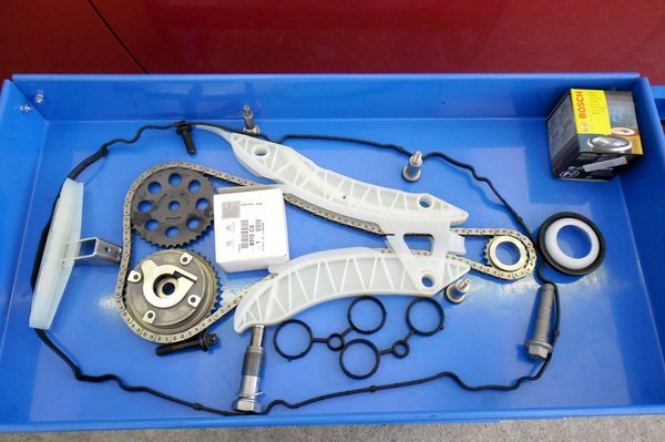 Miután a lánc nyúlása a határértéken felül volt, komplett új szett került beépítésre a hengerfej tisztítása és beszerelése után. Célszerszám nélkül ezt a munkát lehetetlen végrehajtani.