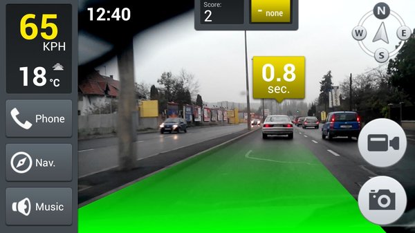 Az Izraelben fejlesztett iOnRoad alkalmazás fő feladata a követési távolság betartására, illetve sávelhagyásra való figyelmeztetés. A telefon kameráját és a GPS jeleit használja a forgalomban való helyzetünk meghatározására. A szélvédőre applikált tartóban kell elhelyezni a telefont úgy, hogy a kamera rálásson az útra. Bekapcsoláskor két, vízmértékekben megszokott buborékos üvegcső segít a pontos pozíció beállításában. Hang és felirat figyelmeztet az ütközés elkerülésére, a szemközti sáv meglátogatására. A teljes verzió 1267 forintba kerül. Nem nagy összeg, ne is várjuk tőle a luxusautókban megtalálható rendszerek szolgáltatási színvonalát. Esőben és sötétben is teszteltem, közel sem működik olyan megbízhatóan, mint verőfényben. A magyar mellékutak kopott felfestése sem kedvez a sávhatárok felismerésének. Autópályán, nappal remek segítség a balesetmentes közlekedésben. Két nagy gomb is helyet kapott a kezelőfelületen: azonnal indíthatjuk a videofelvételt, vagy képeket készíthetünk, ha valami megörökítenivalót látunk. Mikor megérkezünk a célunkhoz, a programból való kilépéskor előzékenyen felajánlja autónk helyzetének elmentését, segítve ezzel a későbbi megtalálást.