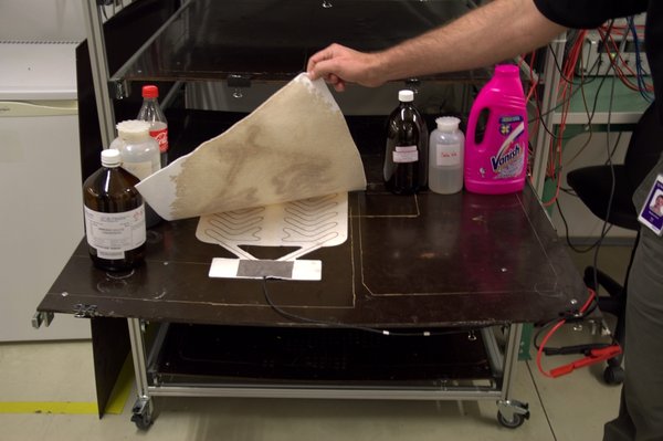 Itt, a tesztlaborban, ismerkedtem meg a szabvány pulóverrel (melynek anyaga, sűrűsége és hőáteresztő képessége adott), a szabvány farmerrel (melyen pl. még a varrások száma is meg van szabva) és a szabvány párnával. Utóbbi egy 50x50 centiméteres, 2 kiló súlyú, 1,4 milliméter átmérőjű golyócskákkal töltött párna. Ez szimulálja az utasülésre dobott kabátot vagy bármi mást, illetve ezzel tesztelik az ülésfűtés hatásait a mindenféle tárgyakra.