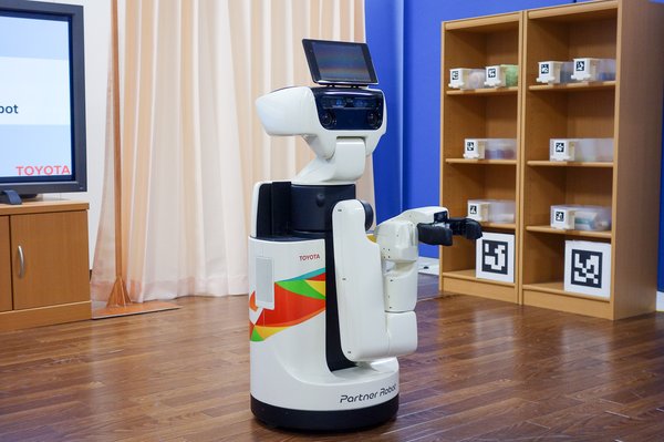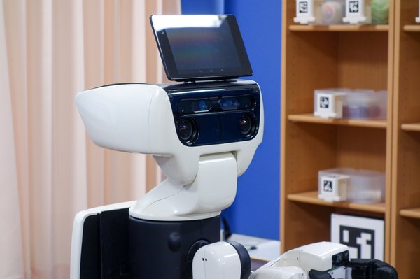 Tovább, másik terem, sok szék, kicsi, berendezett szoba ággyal, szekrénnyel, néhány tereptárggyal, faltól falig parkettával és egy nagy tévével. A porond közepén személyesen a Human Support Robot áll, azaz HSR. Gyomorból jövő, mégis kedvesen csilingelő női hangja van, s – ahogy már kezdem megszokni – ő is csupán egykarú.