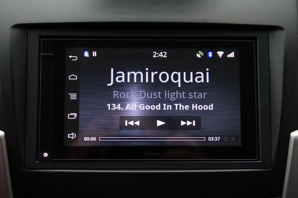 Mint nagyon fontos fícsör még, hogy a Parrot készüléke csatlakoztatható a kormány távirányítójához, többek között ezért sem hiányoztak róla annyira a fizikai gombok. A kormányról hangerőt állíthatjuk, állomást ugrathatunk, satöbbi. A beépített lejátszójával is lejátszhatunk bármit, de ha a telefonunkat csatlakoztatjuk Bluetooth-on, akkor arról is hallgathatjuk a zenéinket. A Bluetooth egyébként 3.0 verziójú és még életemben nem hallottam ilyen minőségű lejátszást Bluetooth-on keresztül, a jellegzetesen recsegős magasak nem voltak ott, ahogy a legdrágább gyári cuccoknál. Van külön iPhone-iPod-bemenete is, további öt USB-vel kiegészülve. Ezeket szimplán a kesztyűtartóba vezették ki, ami nem túl elegáns megoldás. Szívesen látnék legalább egy előlapi USB-t.