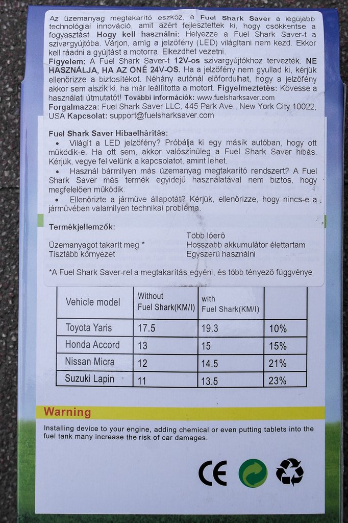 Tisztelt olvasó! Bár szeretjük, ha végigolvassa a cikket, remélem érzi, hogy itt sem lesz semmiféle megtakarítás egy szivargyújtóba dugandó vacaktól, aminek egyetlen tevékenysége, hogy világít benne egy kék LED. Úgyhogy ha arra a megerősítésre számít, hogy a tíz litert zabáló kocsija hirtelen hármat fog kérni száz kilométerenként a Fuel Shark Saverrel, akkor ne is olvasson tovább. Legfeljebb ha érdekli, miért nem.