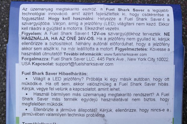 Csak illeszd a helyére, és spórolj – mondja a fuelsharksaver.com oldal, a mi anyanyelvünkön. De ez ne tévesszen meg senkit, egy USA-béli cégé a domain, és ez is szerepel forgalmazóként. A világ minden táján árulják, bár itt egy apró porszem kerülhetett a gépezetbe, mivel az oldalon a termék neve már nem üzemanyagcápa, mint az URL-ben, hanem Fuel Sharp Saver, azaz Üzemanyag Éles Megtakarító. Ehhez képest meglehetősen lekerekített a cucc, akkor már inkább cápa, bár nekem más jut róla az eszembe.