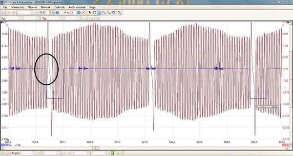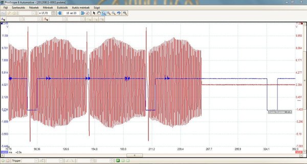 Ki kell jelentsem, hazánkban jelentősen fejlődik a közlekedési kultúra. Tíz autóból maximum hárman dudáltak a csúcsforgalomban főútvonalon passzióból autót tologató őrültre. Néhány perc múlva egy öregpassatos brigád még meg is állt segíteni félretolni az útpadkára (ezúton is köszönöm). A lényeg, hogy sikerült rögzíteni a hiba pillanatát. Látható, hogy a forgattyústengely-helyzetérzékelő jele szűnik meg a hiba beálltakor, ugyanakkor az is kiderül, hogy a referencia feszültséget megkapja.