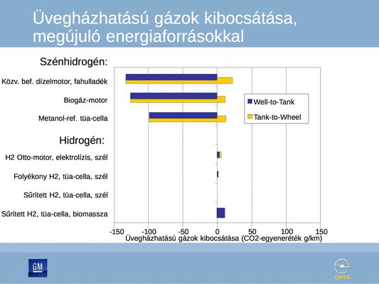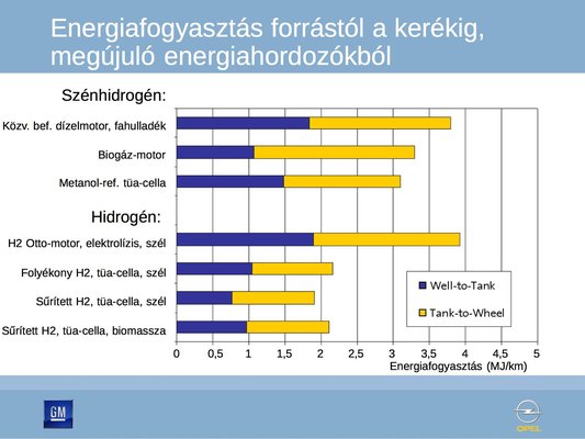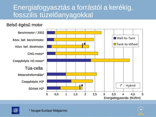 Ha egy mondatban kell összefoglalnunk az ábra tanulságait: lényegében csak egy modern, dízel-hibrid lehet versenyképes a tüzelőanyag-cella legrosszabb verziójával, a matanol-reformálással hidrogént termelő cellával. Vele az a baj, hogy a működése termel szén-dioxidot is, hisz a metil-alkohol tartalmaz szenet és oxigént is. Viszont az összes többi motorváltozat, (leszámítva a cseppfolyós hidrogént pazarló BMW 760h-t) rosszabb a tüa-cellánál.