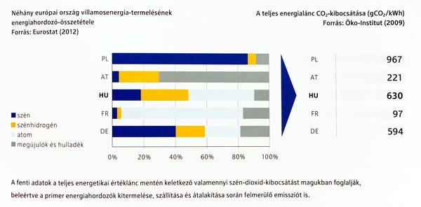 Jobbra pedig egy olyan diagram (sajnos 2009-ből), ami megmutatja, hogy egy kWh energia előállítása és a fogyasztóhoz való eljuttatása mekkora CO2-kibocsátással jár. Lényeges, hogy ebben már a transzformálási és szállítási veszteségek is benne vannak, amúgy itthon 400-500 gramm CO2 keletkezik, amíg egy kWh-t előállítanak, ebből lesz a végére 630.
