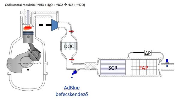 A kipufogócsőbe épített befecskendező fúvóka bepermetezi az AdBlue-t, és a Peugeot esetében még egy keverő rész is segíti a folyadék elvegyülését a gázokkal. Az utána következő SCR-katalizátor aztán az AdBlue-ban jelen levő ammónia segítségével veszélytelen nitrogénné és vízgőzzé alakítja a nitrogénoxidok nagy részét. Már csak a részecskeszűrőnek kell összegyűjtenie a kormot, és a kipufogógázunk olyan tiszta lesz, mint még soha.