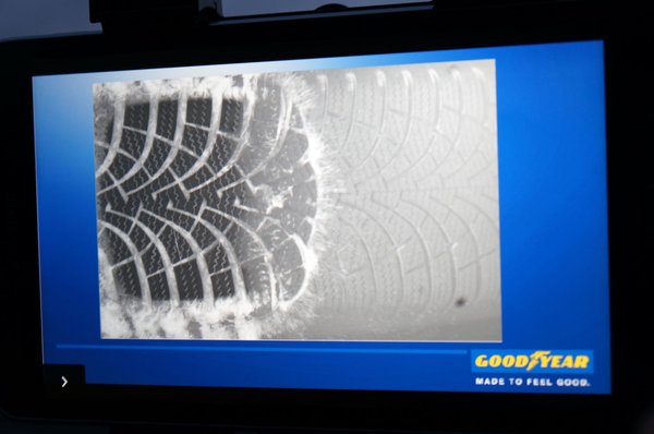 Egy tesztpilóta körbekocsikázott velünk a pályán, megmutatta a műszerfalra biggyesztett tableten azonnal megjelenő eredményeket, a mesterségesen mélyebbre és magasabbra ültetett csatornafedeleket, a műúthibákat, a zajmérést kikapcsolt motorral, de a leglátványosabb talán az volt, amikor száz körüli tempóval berongyoltunk egy sátorba a pálya közepén. Itt egy üveglapra hajtanak az autóval, és egy nagy sebességű kamera felveszi a gumi felfekvési felületét, a lábnyomot. Eddig nem tudatosodott bennem, hogy ez mennyire fontos jellemzője minden abroncsnak: itt látszik, hogyan deformálódik a valóságban, a minta melyik részei érintkeznek állandó sebességnél a talajjal. Az már mindenki számára könnyen érthető volt, hogy a víz kiszorítását is itt lehet valós körülmények között láthatóvá tenni.
