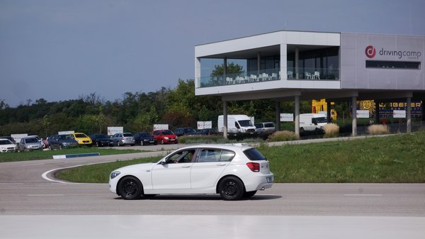 Következő alany, fehér Bömös. Már a facelift utáni, következő 1-es kormányműve van benne, de a kaszni a régi. Mintha középen könnyebben mozogna, de rég vezettem 1-est, most nem is ez az érdekes. Egy kört teszünk a pálya trükkösebb, kanyargósabb részén, miközben már egy másik csapat nyúzza a Baojunt a lankás pályaszakaszon.