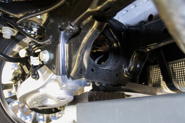 Amellett, hogy az összkerékhajtáshoz kis túlzással csak fel kell akasztani középre egy differenciálművet, mert minden ennek megfelelően van kialakítva, a lengőkarok rengetege mindkét oldalon hosszas nézelődést igényel, míg nagyjából megértjük, hogyan működik. Az összes kisebb-nagyobb kar egy segédkerethez csatlakozik, amely gumipogácsákkal van felfogatva a karosszériához, ezért nem kell minden karnál a rezgések elnyeletése érdekében hatalmas szilenteket használni. Az egész hátsó futóműben oldalanként csak egy nagy térfogatú szilent van, ami az erőhatásoknak megfelelően tervezetten deformálódik.