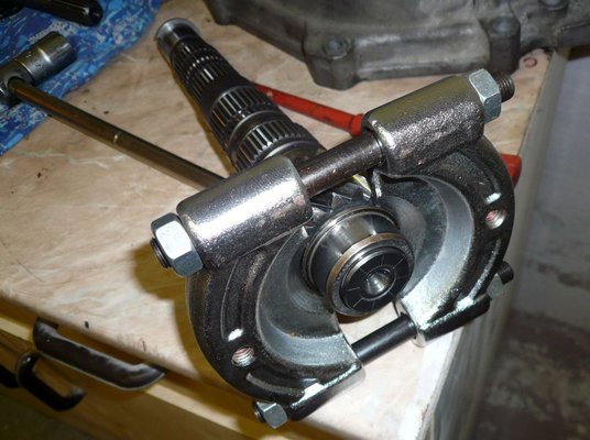 Közvetlenül egy fogaskerék előtt volt a gyűrű, tipikusan a tányéros csapágyszétválasztó/szeparátor funkciójának való feladat. Itt már előjött az anyagminőség problémája, a finommenetes szár és az anya ugyanis közönséges villáskulccsal elkezdte kinyírni egymást, amikor elkezdtem erőből összehúzni a feleket. Végül a feleket kalapáccsal finoman kocogtatva megindult a gyűrű, amivel sikerült megmentenem egy olyan csapágyat, ami meghaladja a lehúzó értékét. Már ezért megérte megvenni. Ha még néhány feladatot kibír, a végén a kedvenc szerszámommá válik.