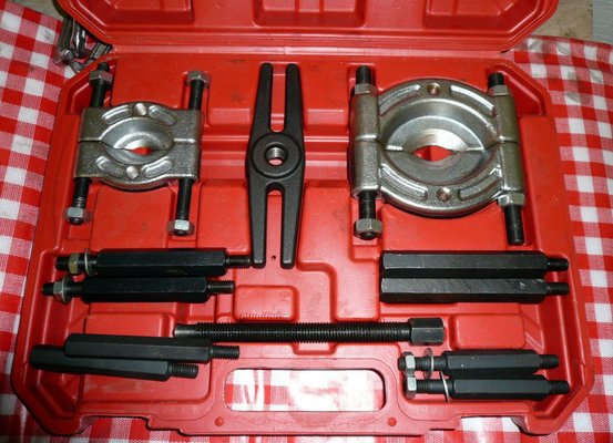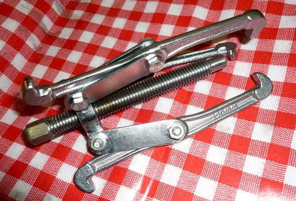 Aki nem autószerelésből él, komoly dilemmával fog szembesülni a lehúzóvásárlásnál. Van a minőség legalja, a hátsó-kínai pár ezer forintos, sőt, most már egész készletet adnak ötezer alatt, meg van az ipari cucc, több tízezerért. Középút nincs. Mindennél jobban szeretem a jó szerszámot, mert csak azzal jó dolgozni, de vannak határok. Egy tárgyért, amit évente háromszor használok, nem fogok kicsengetni húsz-harmincezret. Márpedig egy nagyobb háromágút rendes anyagból, karcsú karmokkal, amik mindenhová beférnek, ennyiért lehet megkapni, még használtan sincs tizenöt alatt. Nekem pedig nem csak egy ilyen univerzális kellett, hanem a váltótengelyek kíméletes szétfűzéséhez egy úgynevezett tányéros is.