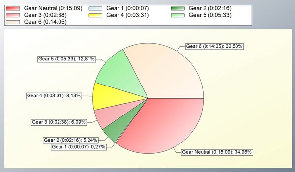 A kütyü által készített tortadiagramon jól látszik, hogy a spórolós körön majdnem az idő felét ötödikben és hatodikban töltöttem, míg amikor siettem, fel se váltottam hatodikba. Nem csoda, hogy az átlagfordulatszám 1400 alatt maradt, amikor a fogyasztásra mentem; a 2141-es érték a zúzós menetben még nem is olyan extrém, de egy turbós motort fölösleges is lett volna szétforgatni.